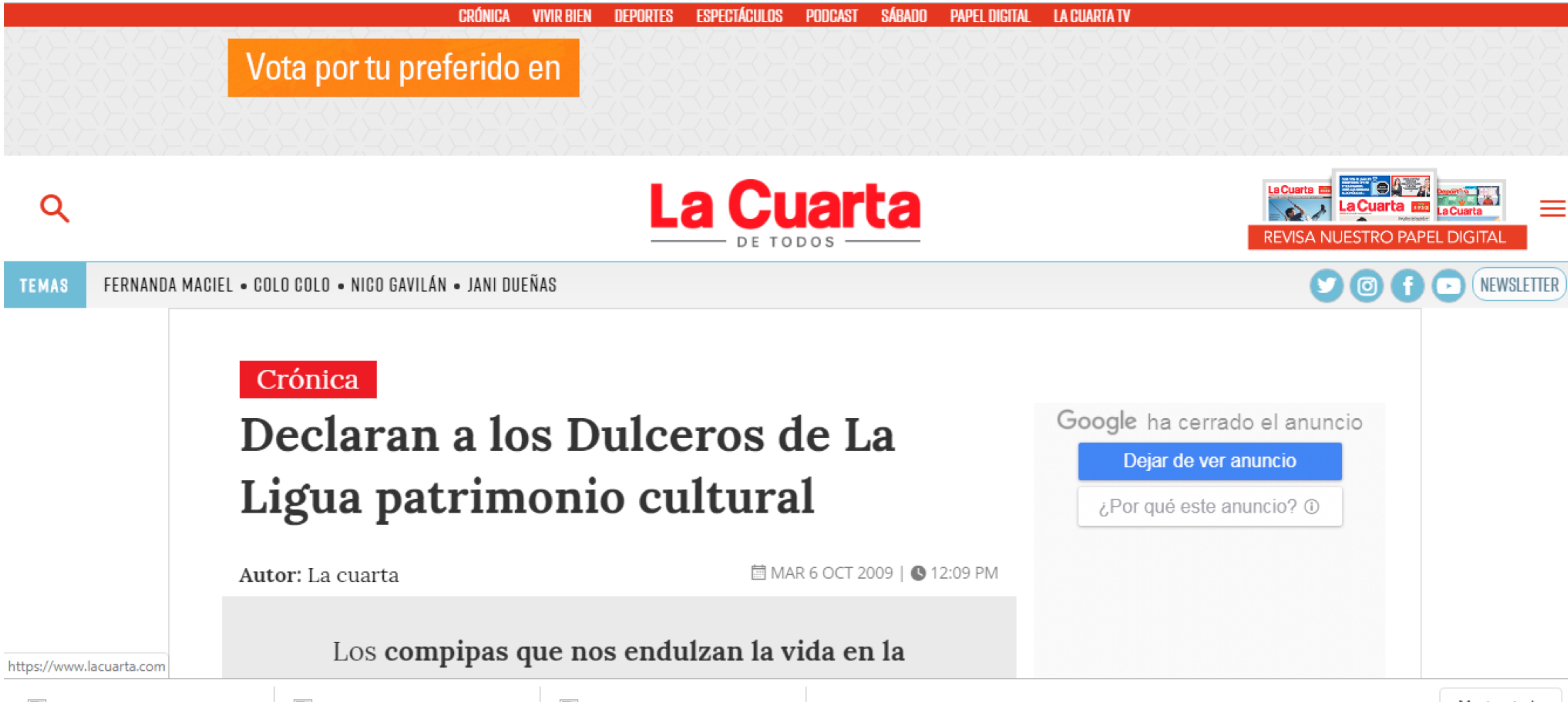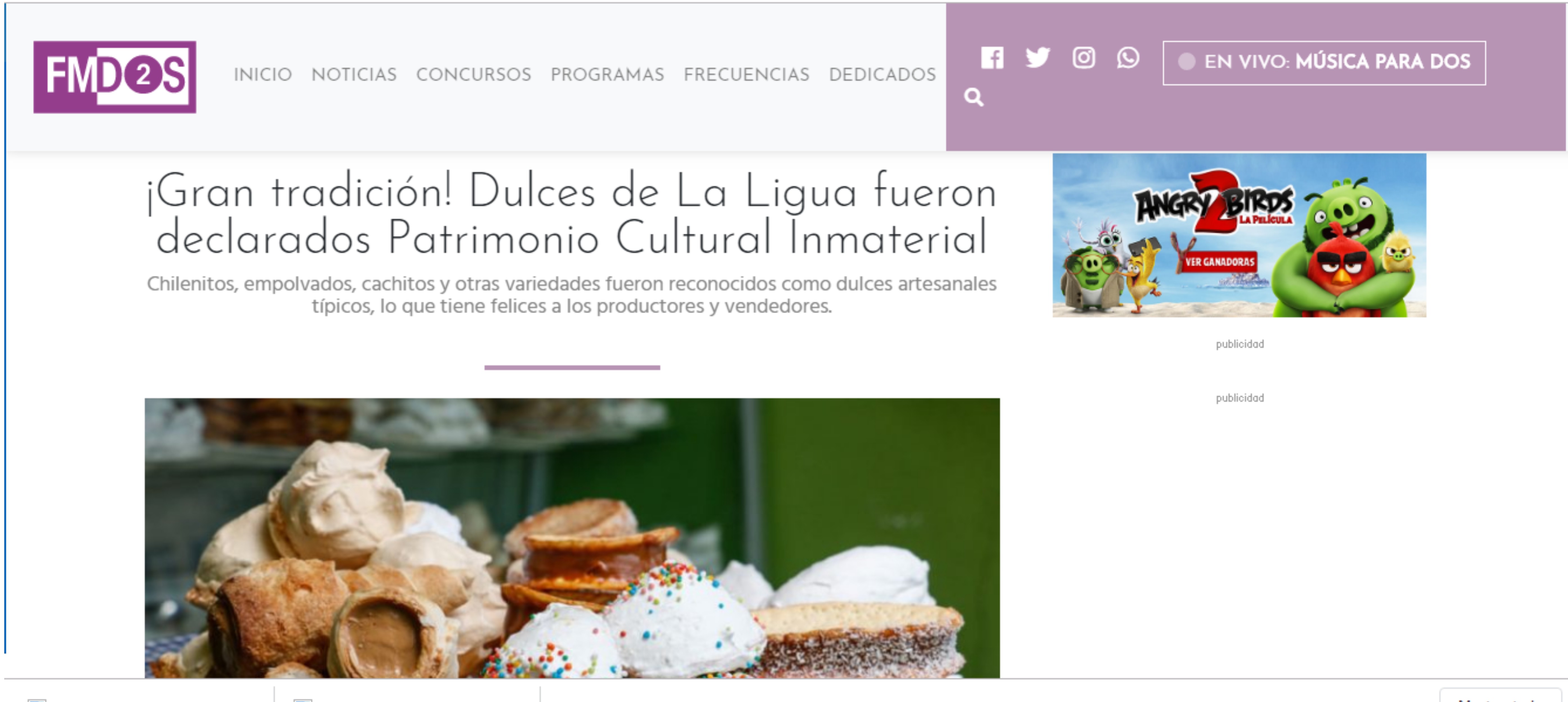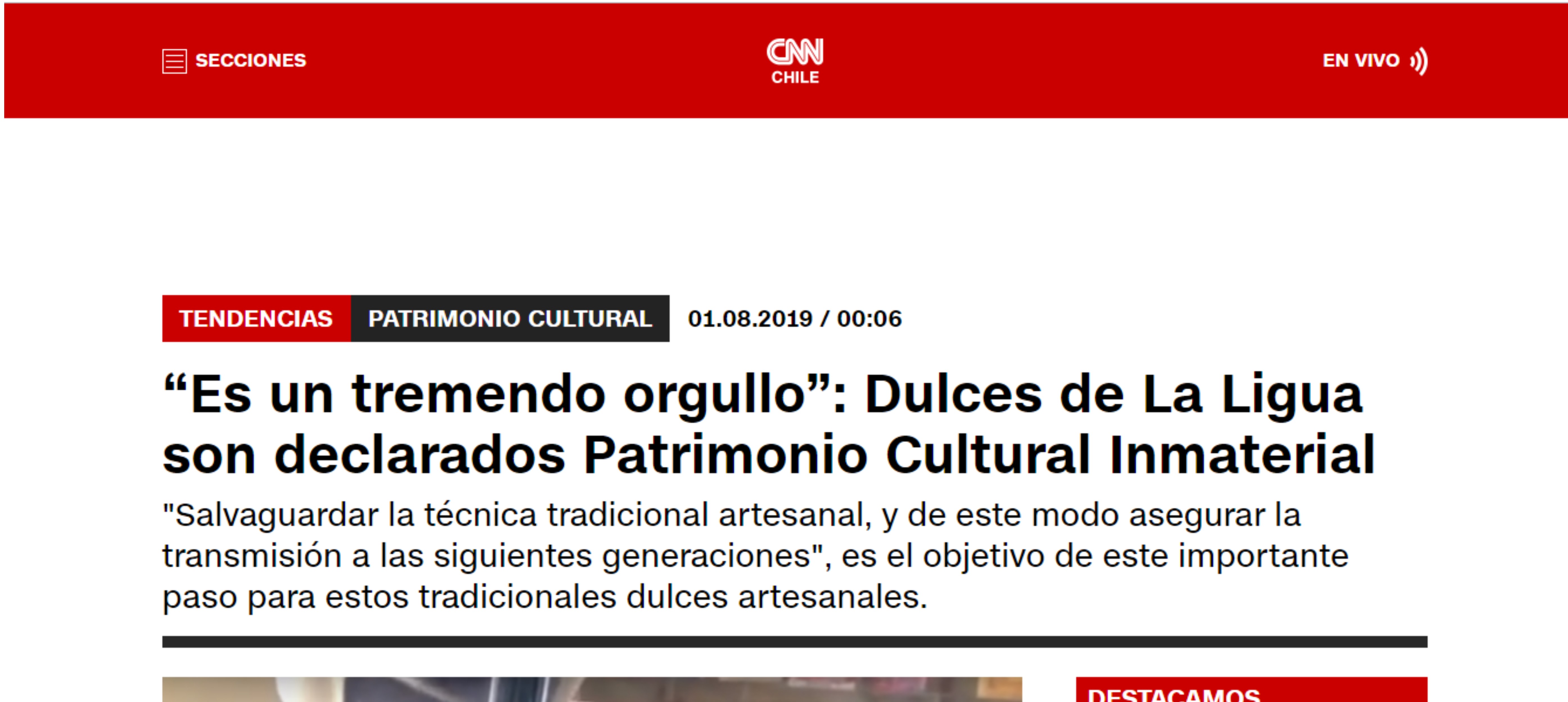 En 2014, el entonces Consejo de la Cultura financió la realización de una investigación sobre los Dulces de La Ligua, que fueron reconocidos por ser elaborados con técnicas tradicionales artesanales, pues la forma de fabricación es parte de las recetas que han sido traspasadas de generación en generación.